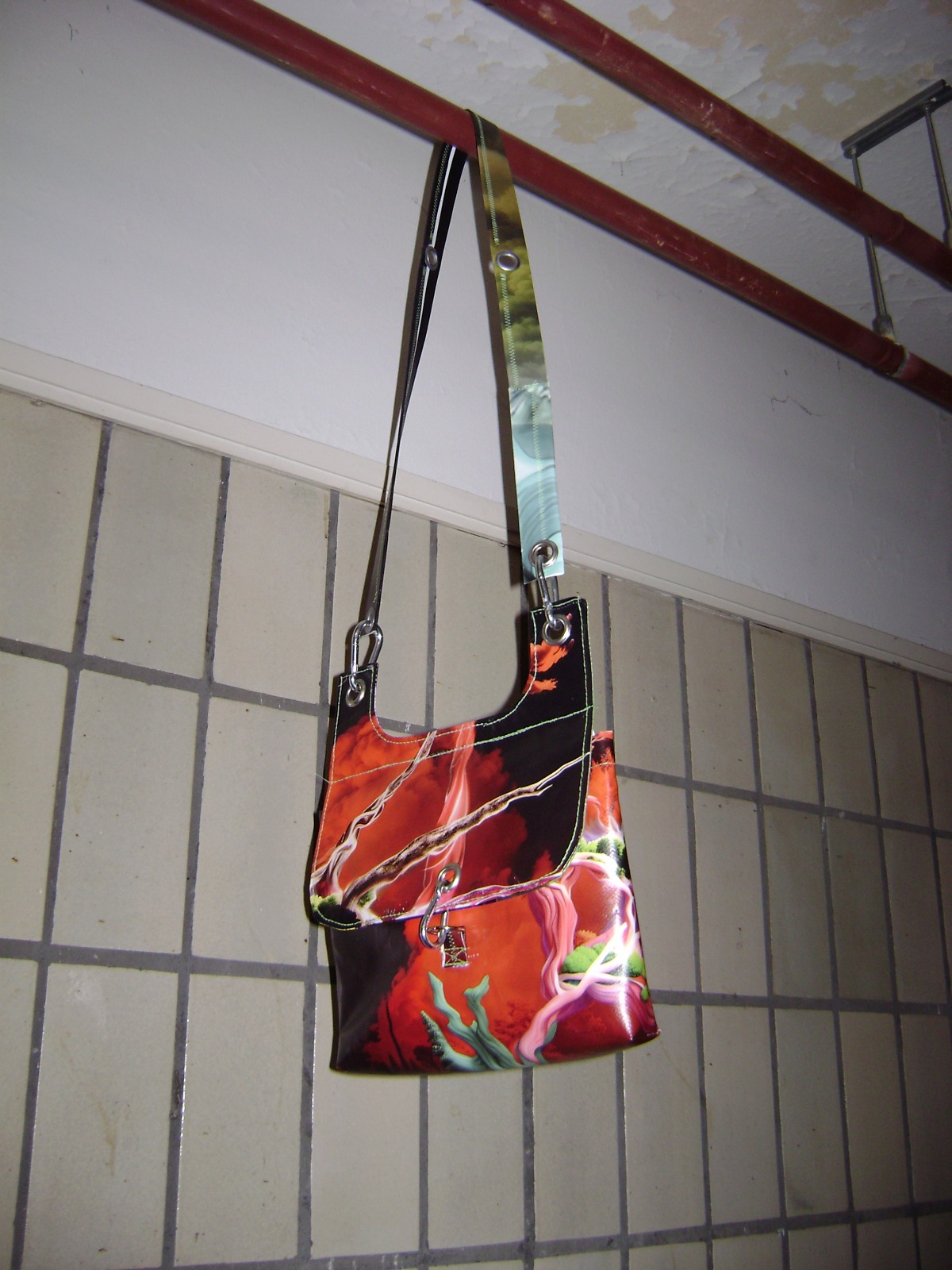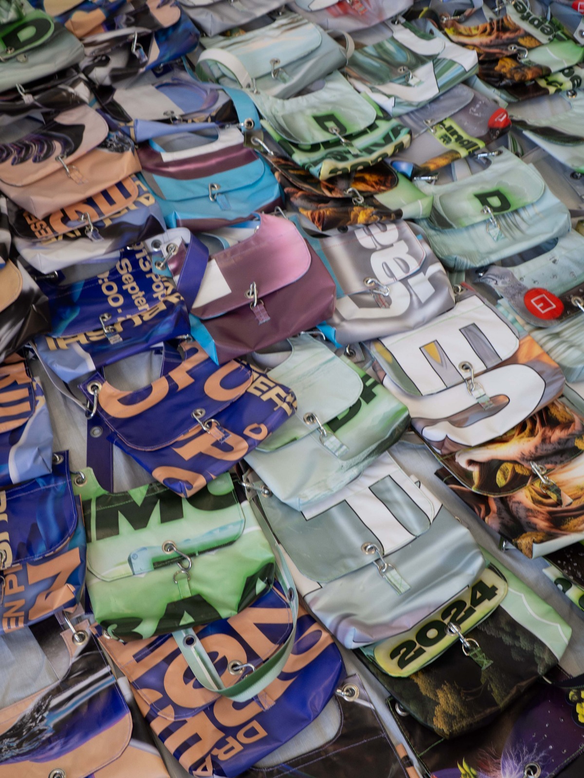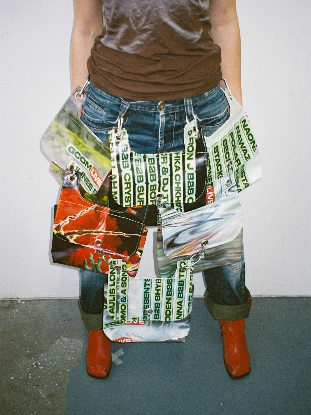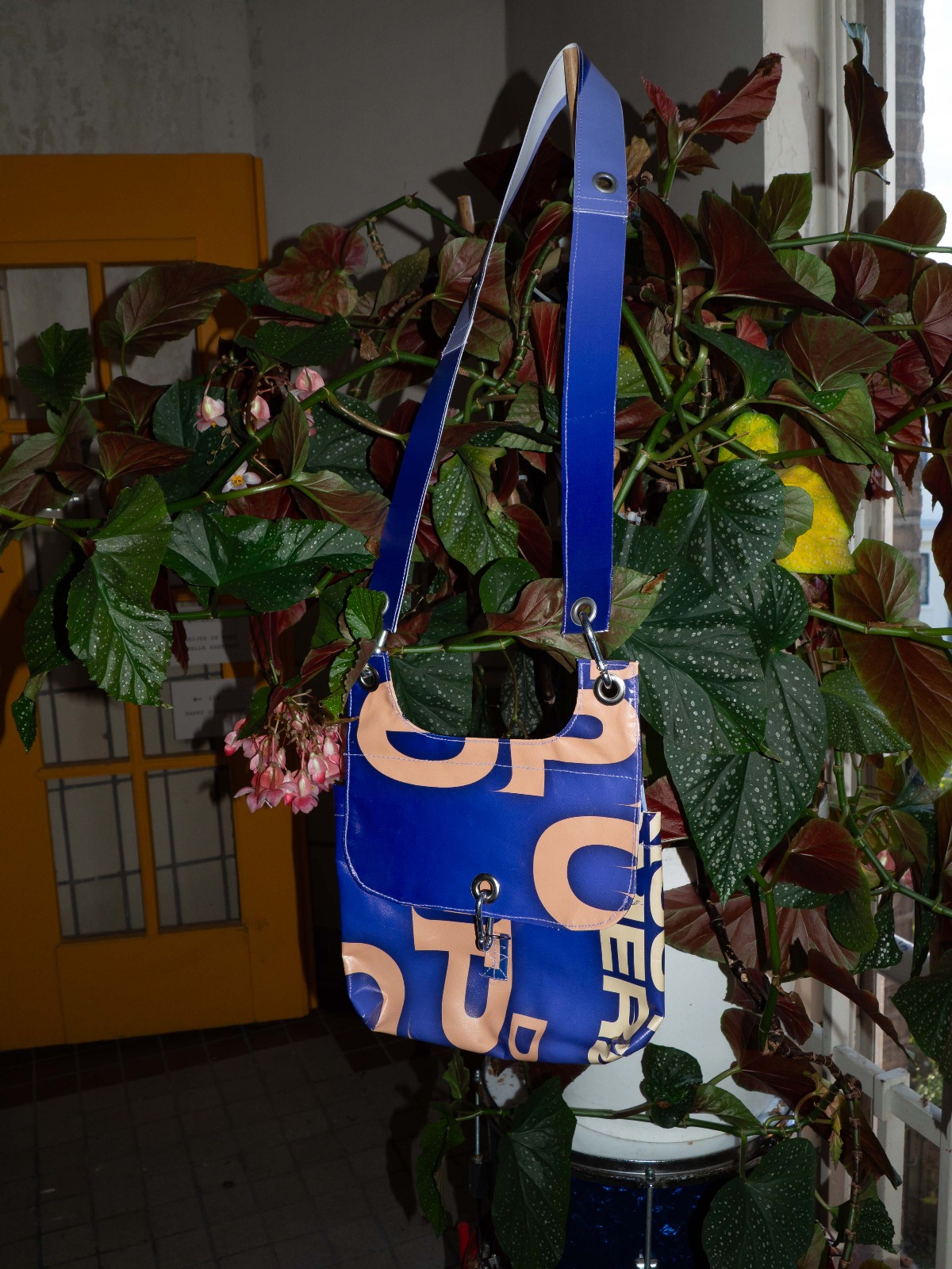 The Lucy x Draaimolen handmade banner bags. Made from banners of previous editions of Draaimolen & Holy pink. Adjustable through the carabiner hooks, to wear how you like it.